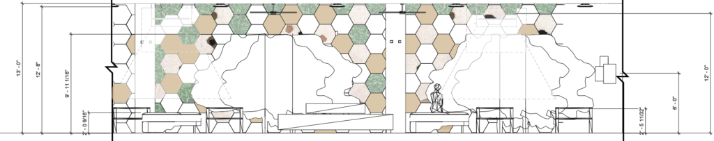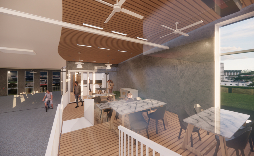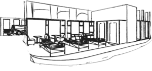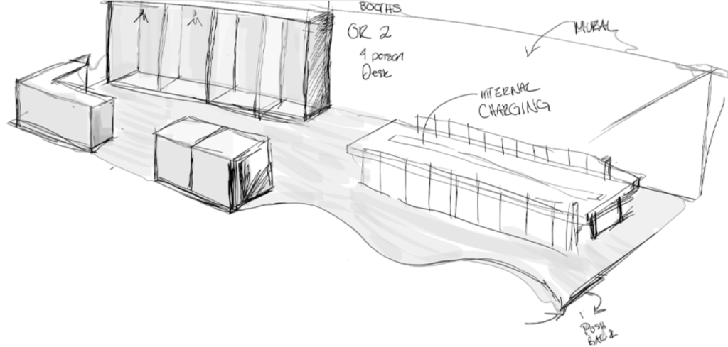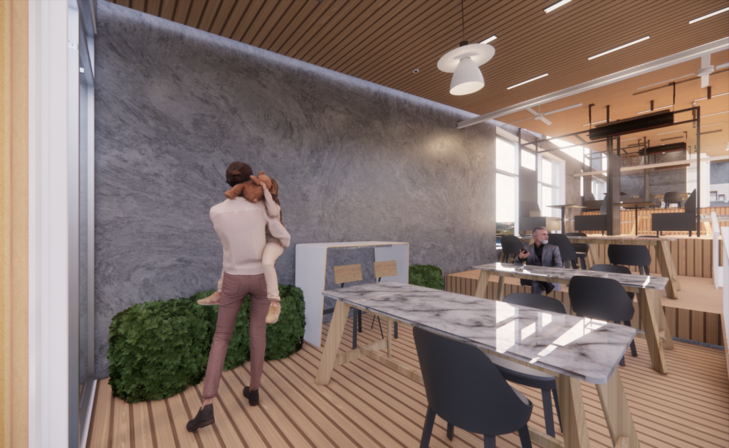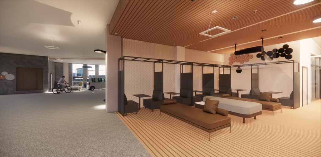One of the main amentias that is lost when you live completely mobility is a designated full kitchen and dining table space. It seems to always be a reduced variation but at times you long for additional counter space or a new surface to sit and work at. The 7th floor houses a full shared kitchen, dining and private or public work zones. Because the community is based on that of how those who are homeless and or Van lifers the interactions with each other is a safe comfort place. The designed focuses on providing a sense of place among the noise.
