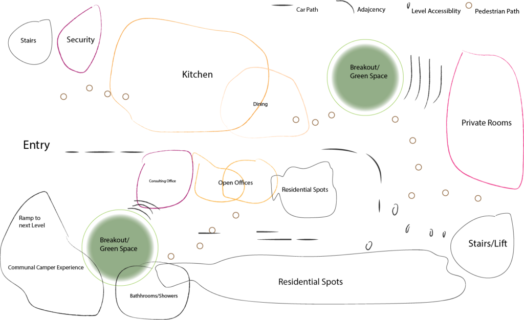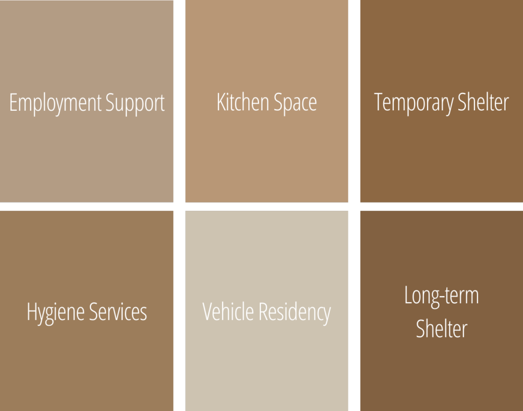 Giving those who live in their vehicles a housing experience everyone deserves. The different levels makes it so the different kinds of residents are comfortable, safe and at home while living in this Urban Safe Parking space.