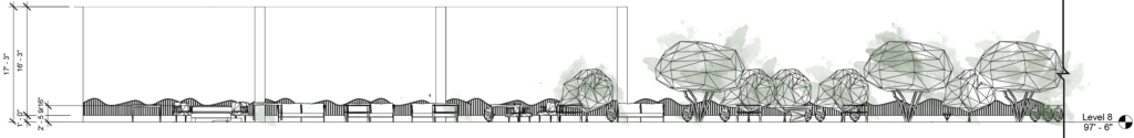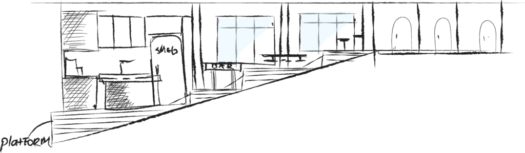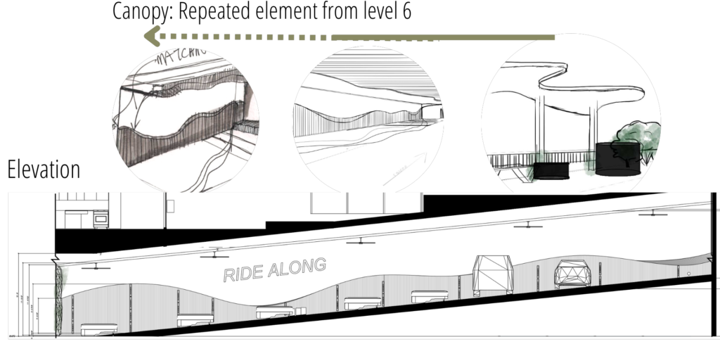 The general design is guided by these three design principle concepts. Sloped paved regions in Ride Along were created to make the areas livable using platforms, positive/negative volumes and wayfinding to connect the overall narrative of the environment.