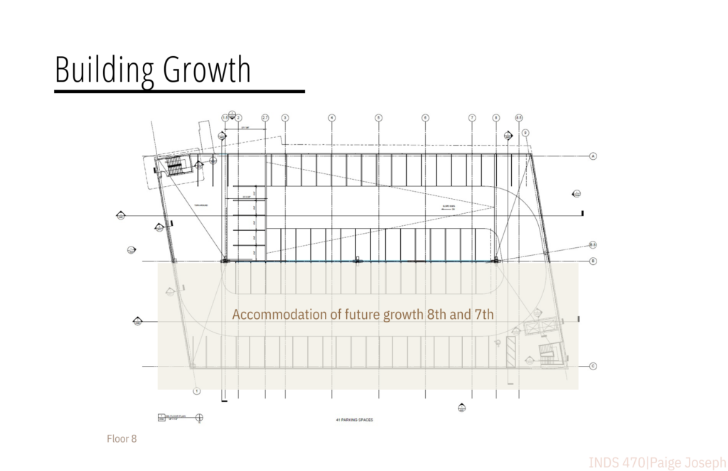 The projects visual cues to help guide and distinguish the direction of traffic to pedestrian flowing between the three levels of the 8 level parking deck.