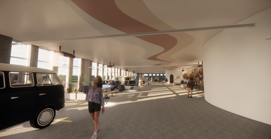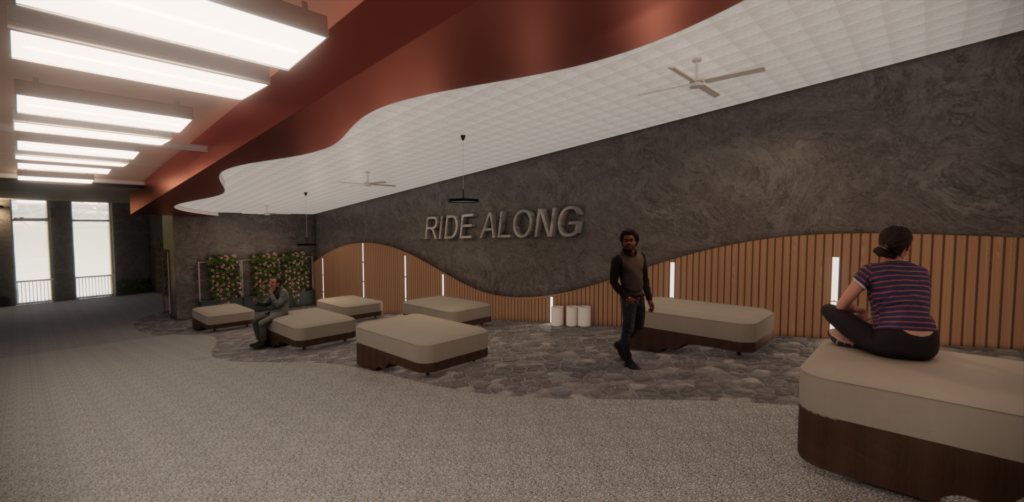 Ride Along explores wordplay to create a distinct identity and a sense of space as you progress through the many levels. The design is open to anyone and takes into account the experiences people have had. You are drawn into the space by the use of organic shapes that are an abstraction of motorways. On various levels, it demonstrates a sense of belonging and identification as well as a secure environment that embraces the novel concept of a temporary home. Embracing the idea of cozy, secure nomads’ houses, Ride Along endeavors to be a place where one feels safe, a place from which one’s strengths of character are drawn. The project developed was developed with the idea of Querencia; everyone deserves a home and safety. The project is located in Seattle, a city with some of the strictest regulations and laws for living in your car in the United States of America.