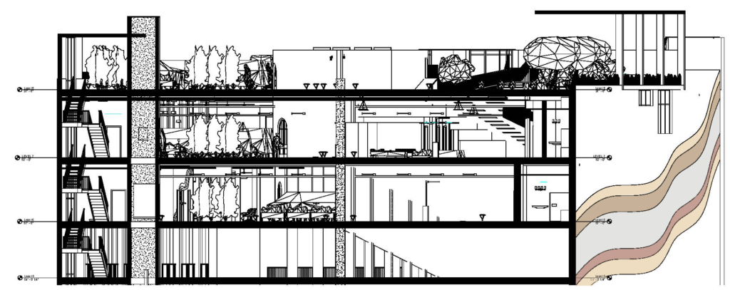 Transverse Building Section with a glimpse into the relation of the slopes to the level building half as well as the strong visual language.