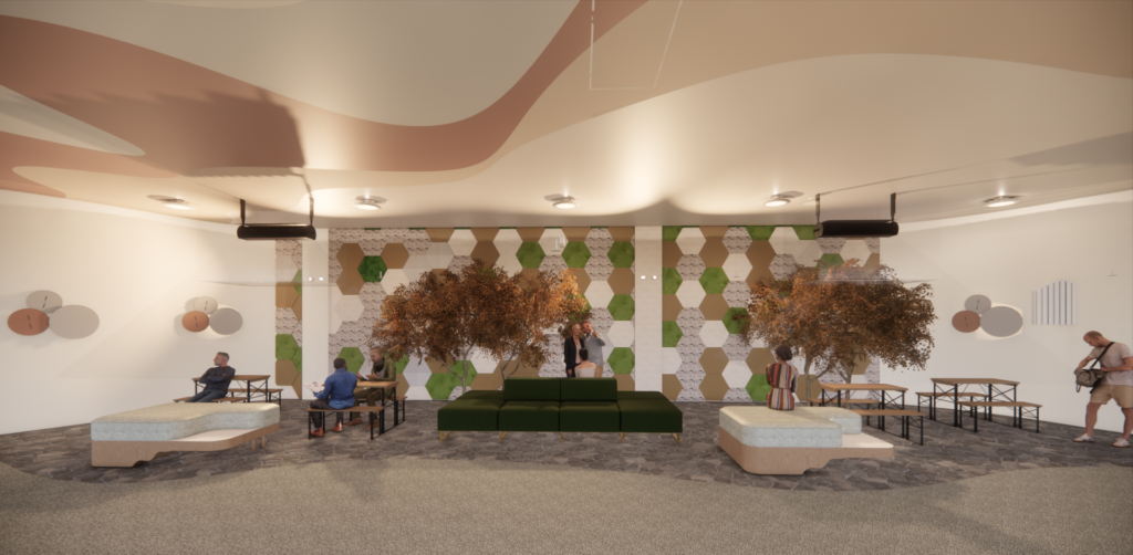 The shapes in the space promote socializing and openness. A feeling in the space of always having a place to be in